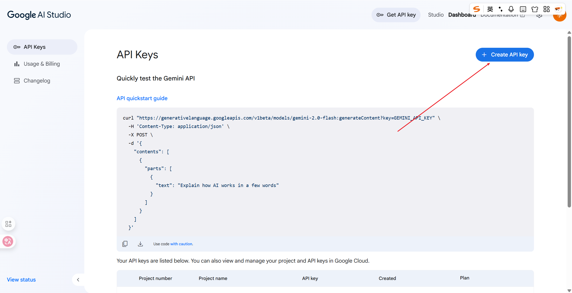 这里的API_KEY指的是google的KEY,首先你肯定需要一个谷歌账号,然后访问 aistudio拿KEY